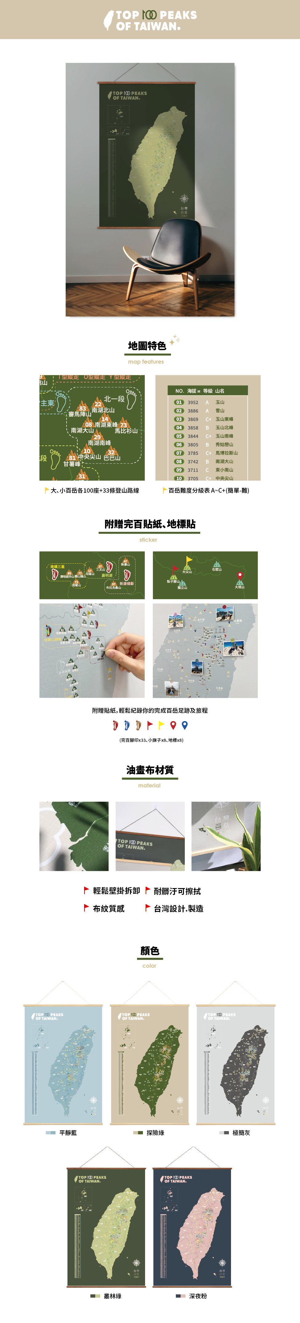 獨家設計的超大台灣百岳掛畫,記錄自己登頂的感動,可以手寫紀錄、黏貼紙膠帶、貼紙記號、張貼旅行的照片,記下您走遍的每個台灣山頭。